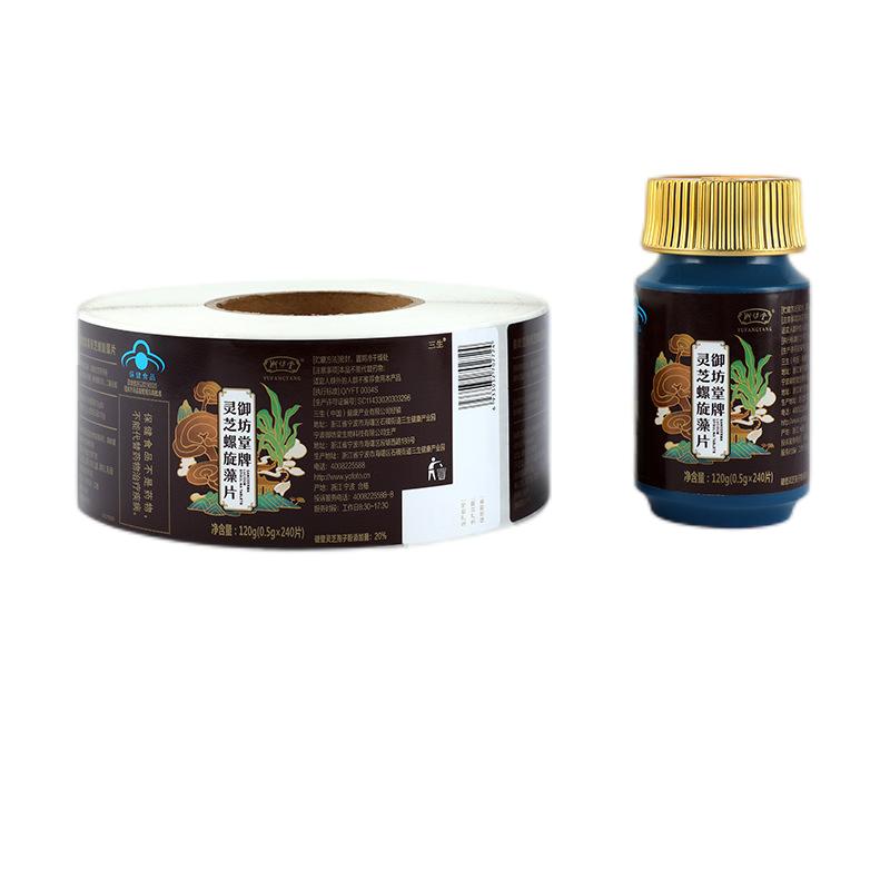 保健品标签:该不干胶标签采用金色铝箔纸材质进行印刷,再加上覆膜、模切等工艺,同时喷印变量二维码,为每款产品单独标注身份信息。此类标签还可以加上烫金、起鼓、覆亚膜等工艺来达到包装美观、实用的效果。标签可根据需求做成卷标机器贴标和手工贴标两种形式,也可根据产品的存放环境和被贴瓶体的材质,选择普通不干胶、加粘不干胶和强粘不干胶等。也可选择铜版纸、珠光膜、合成纸、亮银龙、彩虹银、透明不干胶、亚银PET、拉丝银、拉丝金、亚银铝箔等材质。